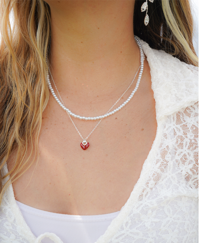 Collar doble de perlas sintéticas y cadenita con dije de corazón rojo, fabricada en rodio y con una medida de 40cm,44cm y 5cm de extensión