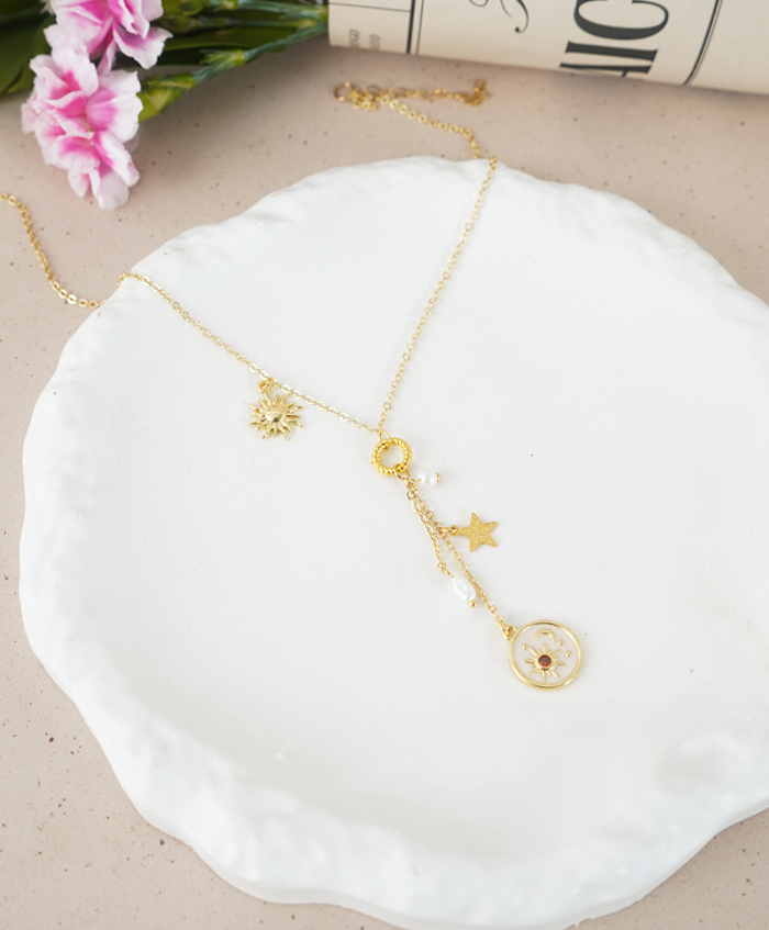 Cadenita con dijes solares, fabricado en oro goldfilled y con una medida de 36cm,4cm y 5cm de extensión..