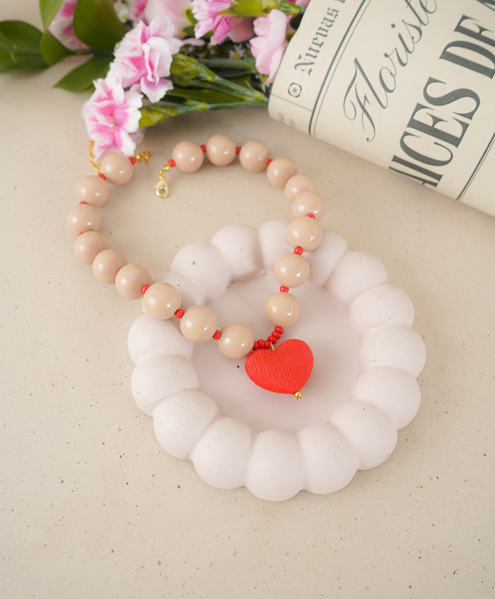 Choker de maxi bolas con dije de resina de corazón rojo, con una medida de 38cm y 10cm de extensión..
