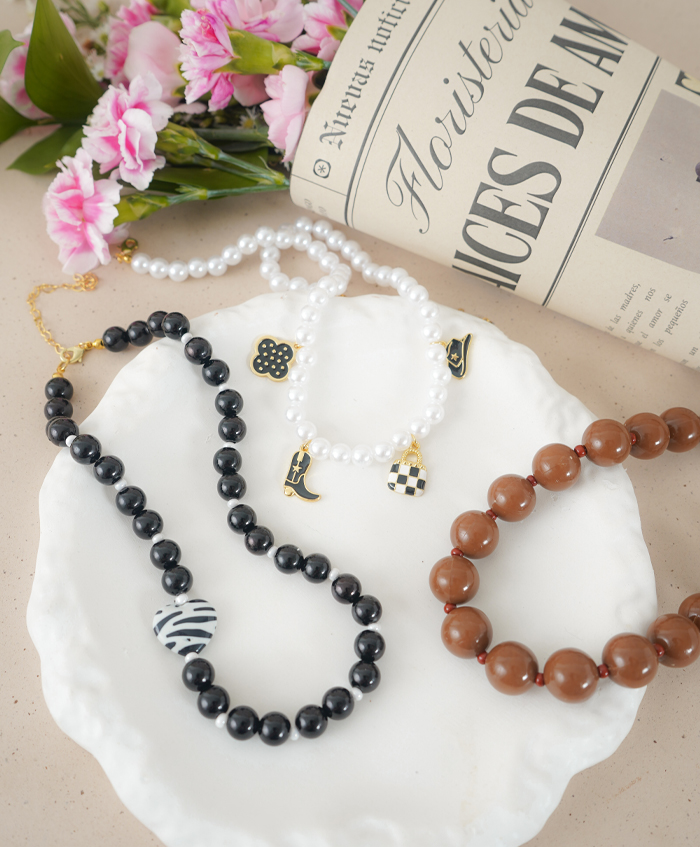 Choker de maxi bolas cafés, fabricado en ábaco y con una medida de 38cm y 10cm de extensión..