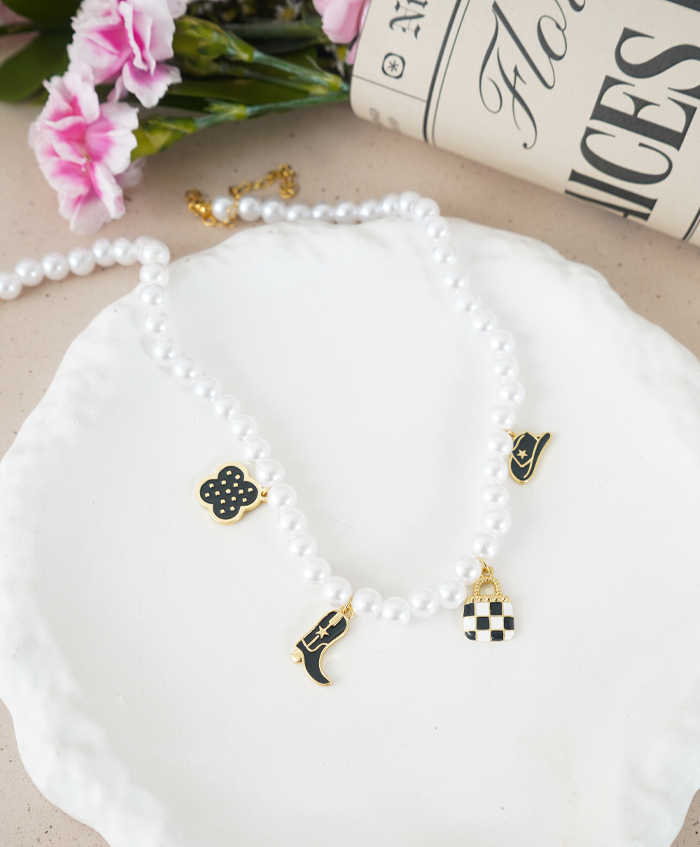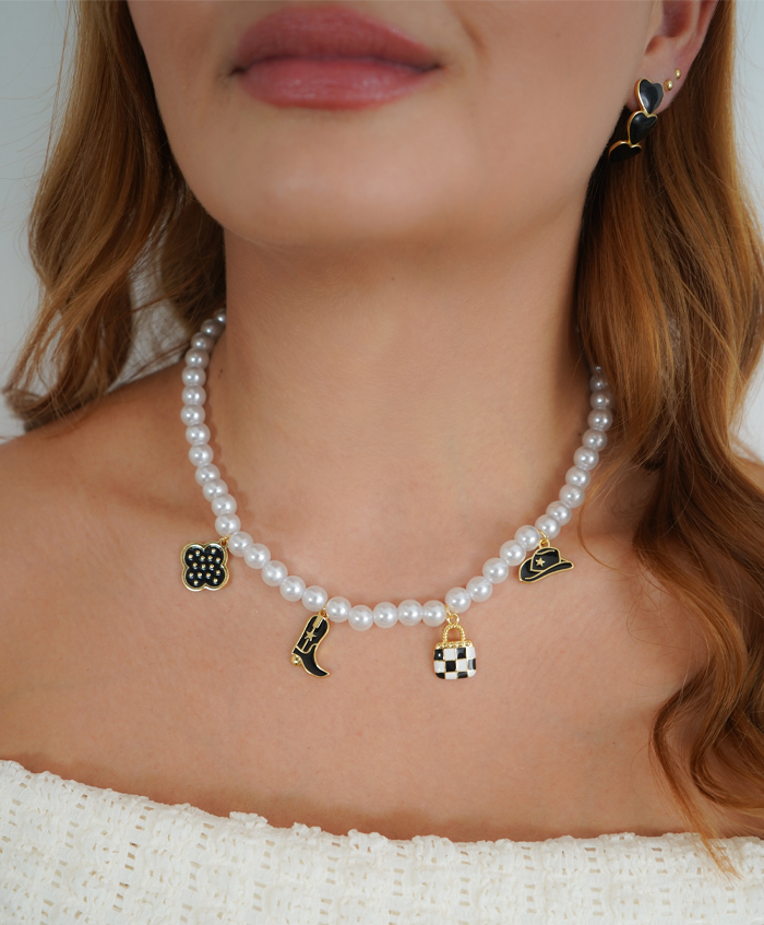Choker de perlas sintéticas con dijes negros, fabricado en rodio y con una medida de 38cm y 10cm de extensión..